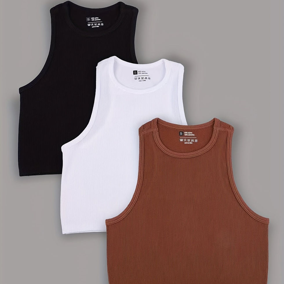 3-Pack Ribbed Knit Sports Tank Tops, Seamless Sleeveless Elastic Crop Tops, Run