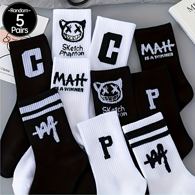 5 Pairs Women's Knee-Length Socks - Cartoon Print Crew Socks with Playful Phras