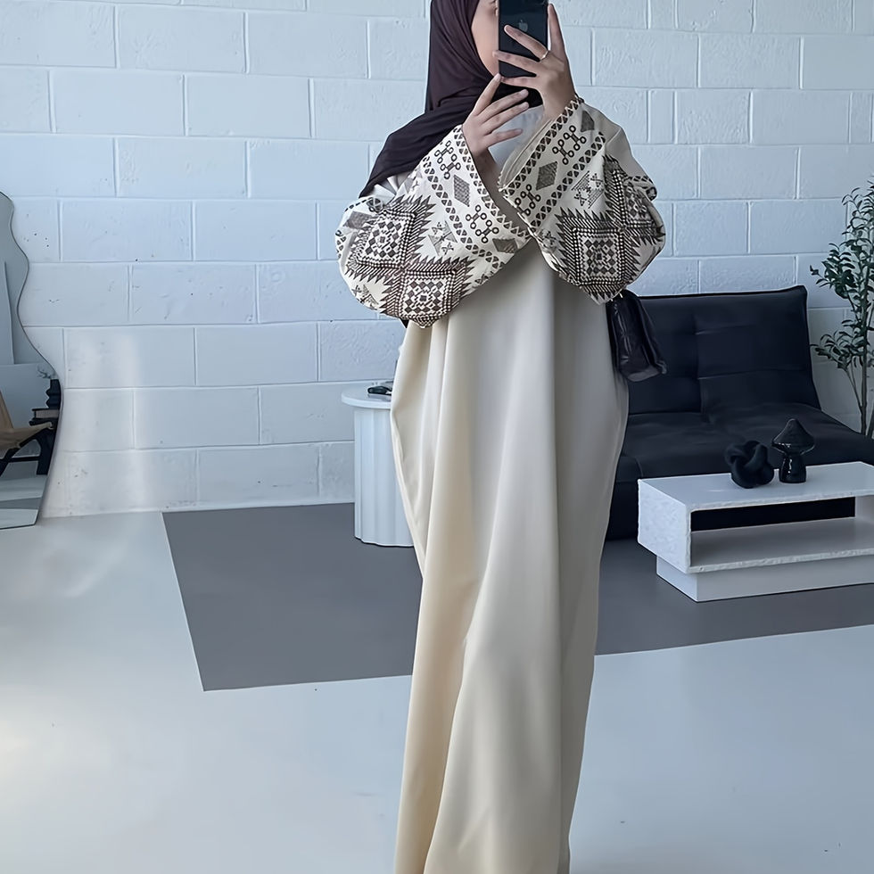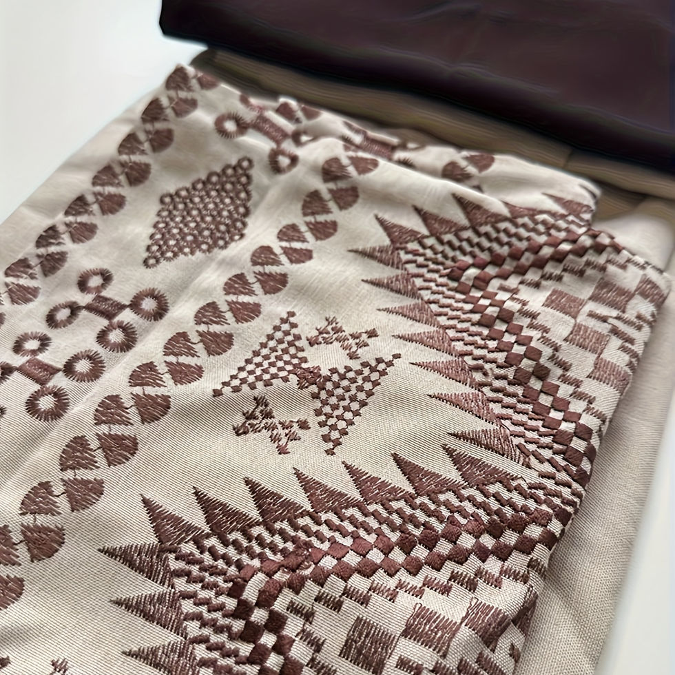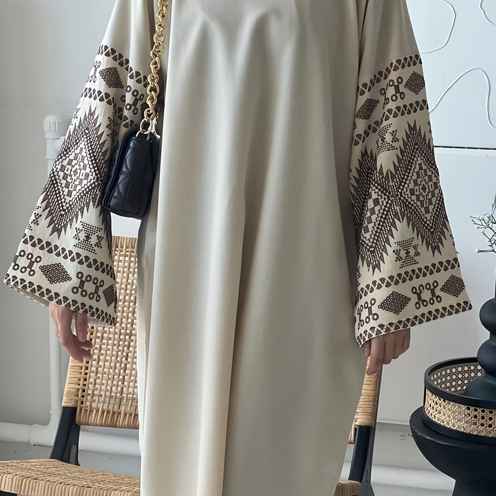 Elegant Embroidered Maxi Dress with Geometric Pattern - Beige Polyester, Long S