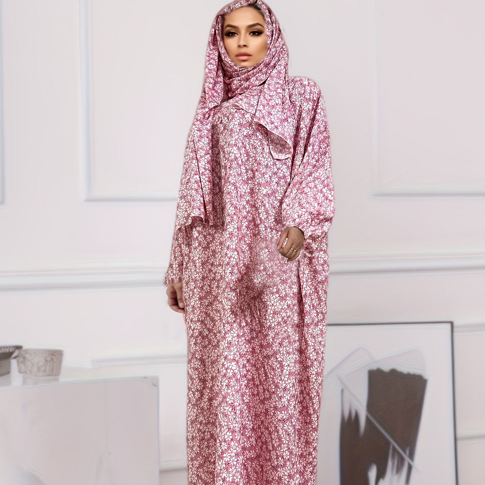 Elegant Floral Print Women's Prayer Modest Dress with Hijab Scarf - Long Sleeve