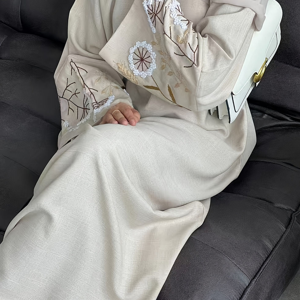 Elegant Long-Sleeve Abaya with Floral Embroidery - Beige, Non-Stretch Fabric, P
