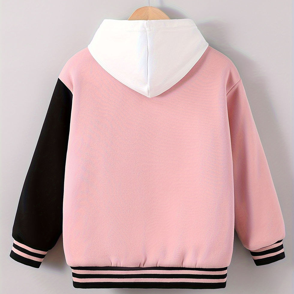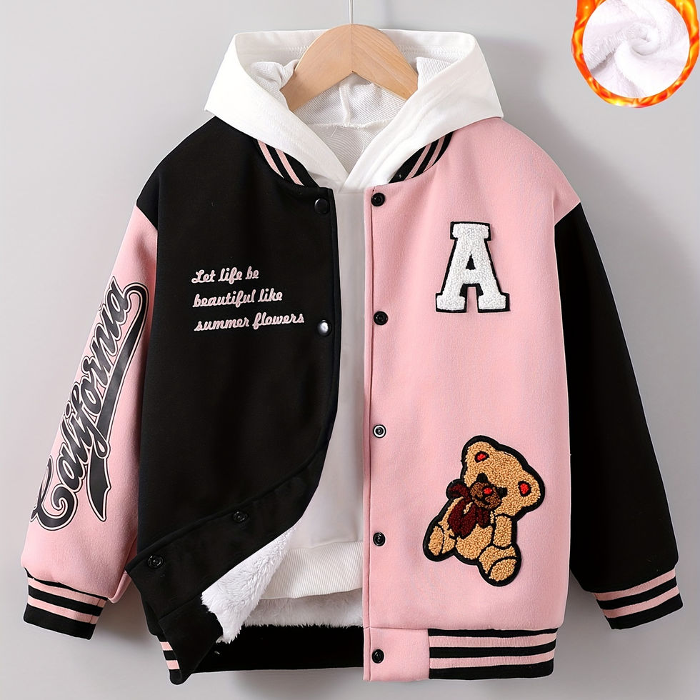 Girls' Preppy Color-Block Varsity Jacket with Letter "A" & Bear Embroidery - Co