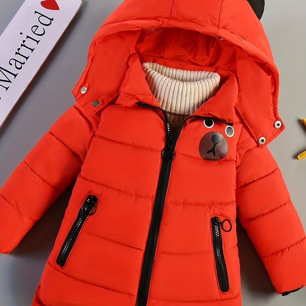Girls' Winter Jacket with Hood & Bear Logo - Cute Korean-Style Kids' -Like Coat