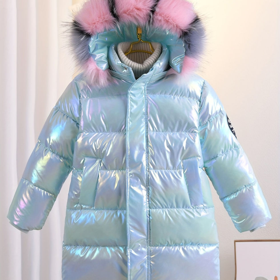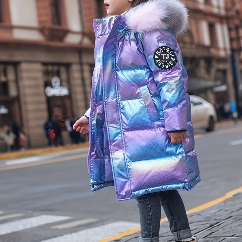 Girls' Winter Parka - Trendy Metallic Purple Hooded Jacket with Faux Fur Trim,