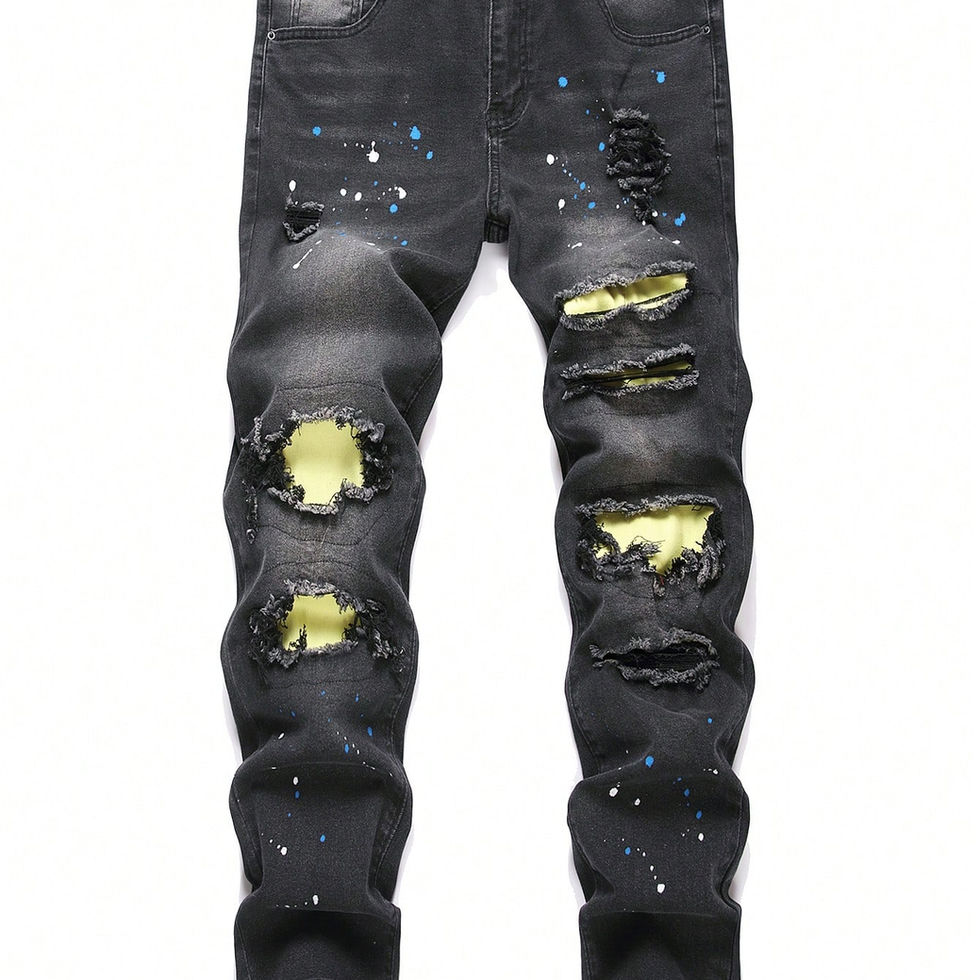 Manfinity EMRG Men Splash Ink Print Ripped Frayed Rag Stitching Jeans, Slim Fit