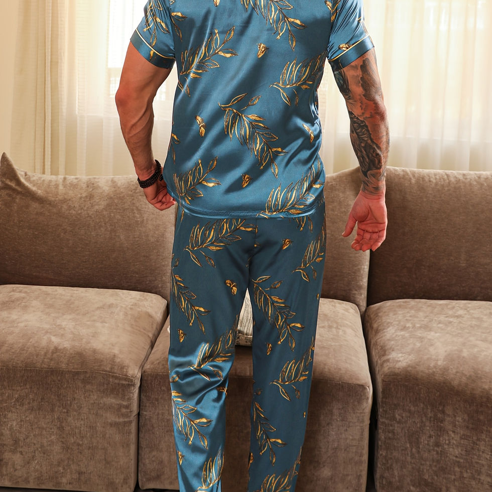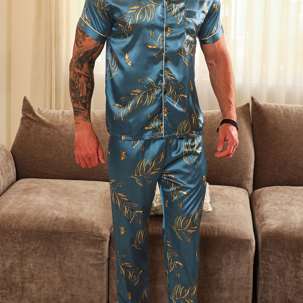 Men's 2pcs Casual Plant Pattern Pajama Set, Short Sleeve Collared Shirt and Ela