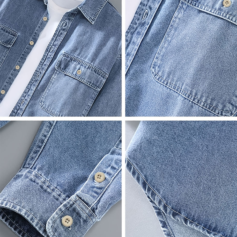 Men'S Casual Denim Shirt - Solid Color Washed Blue, Non-Stretch Fabric, Classic