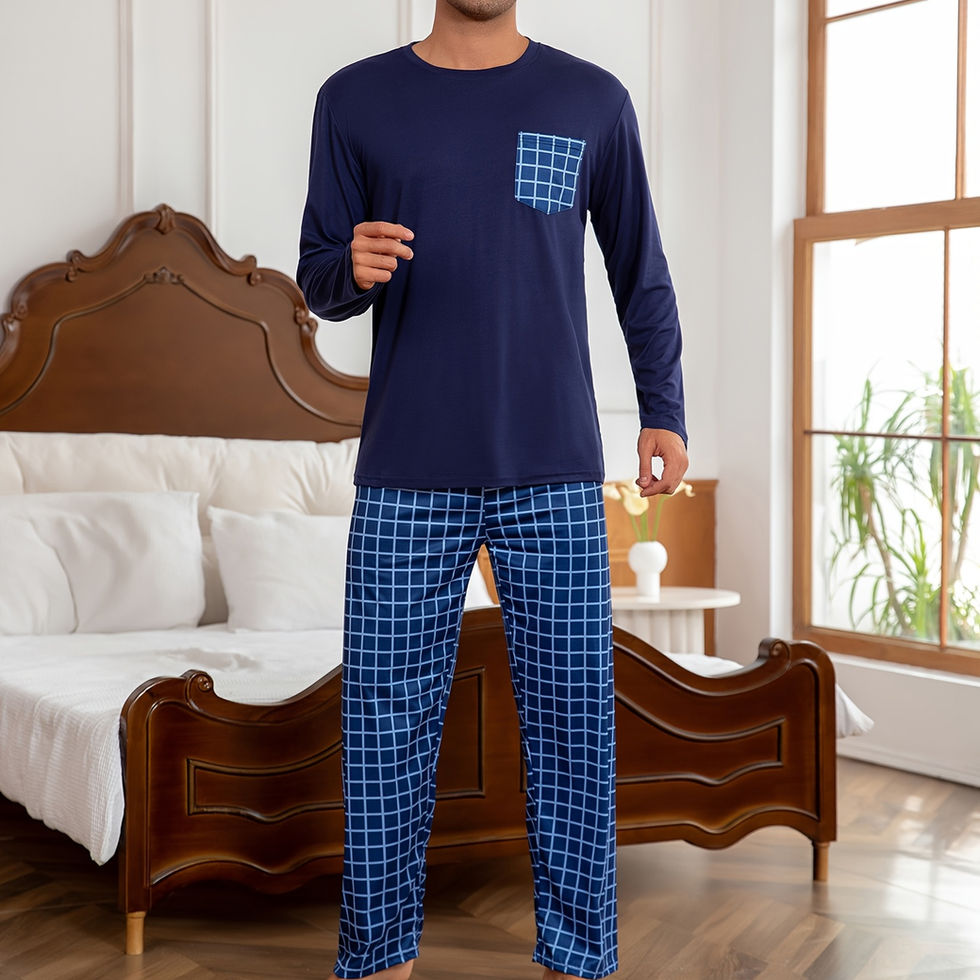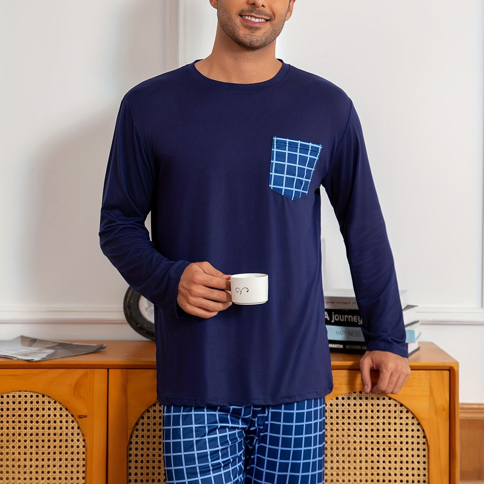 Men's Navy Blue Long Sleeve Plaid Pajama Set with Pockets, Round Neck Pullover
