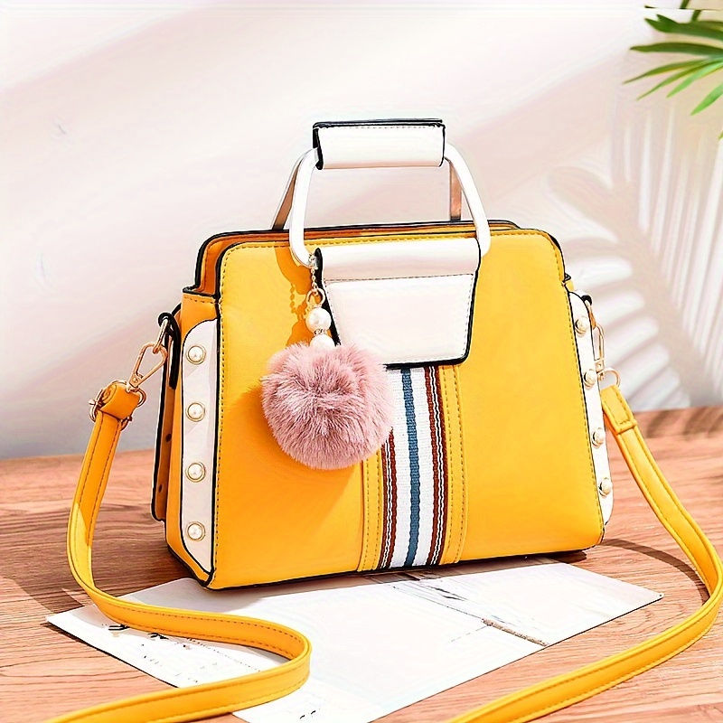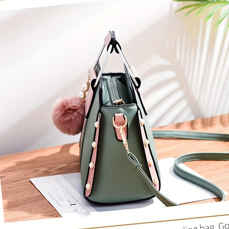 New Korean Style Versatile Shoulder Bag, Colorblock Satchel Bag With Pom Pom De