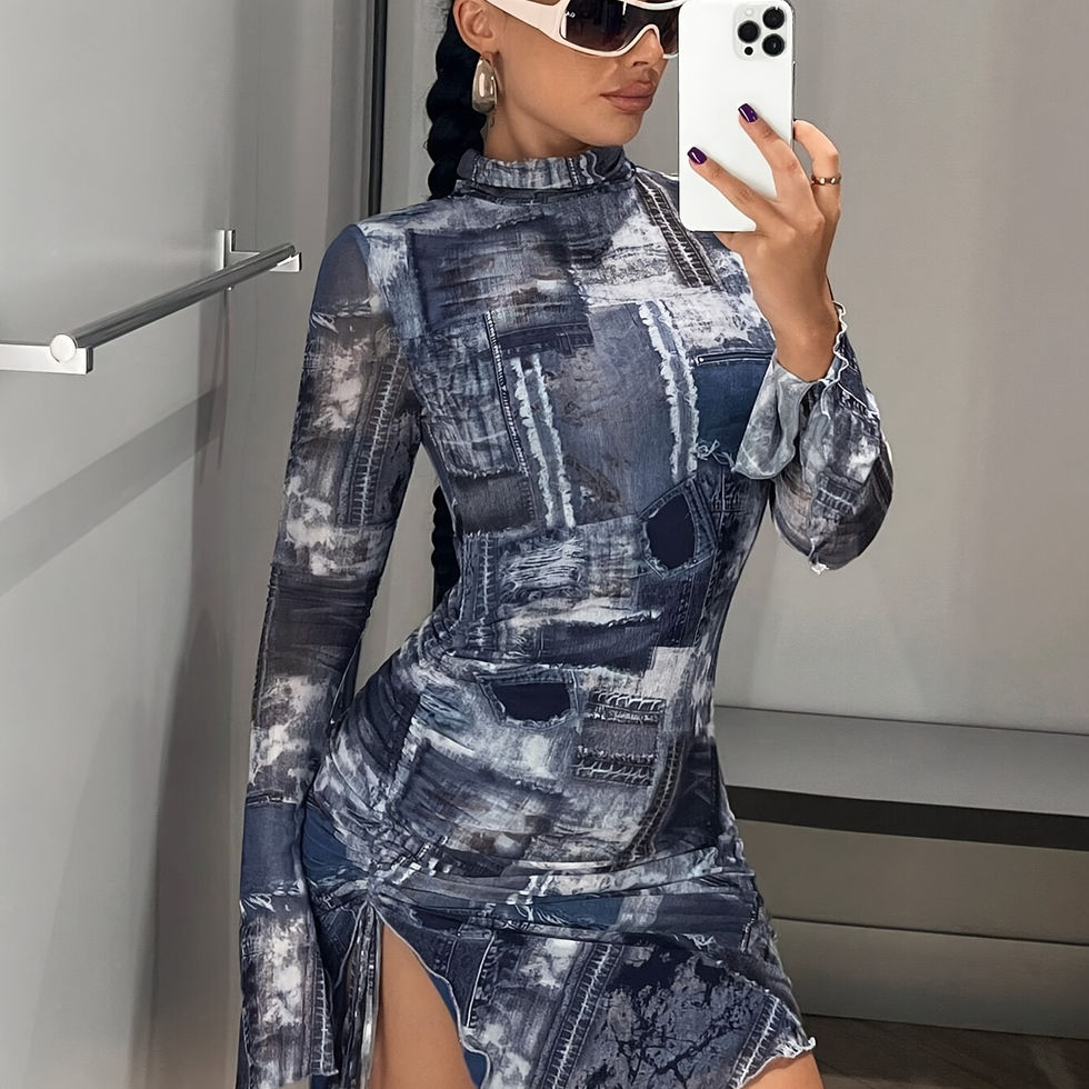 Patchwork Print Asymmetric Hem Bodycon Dress, Sexy Flare Long Sleeve Mock Neck