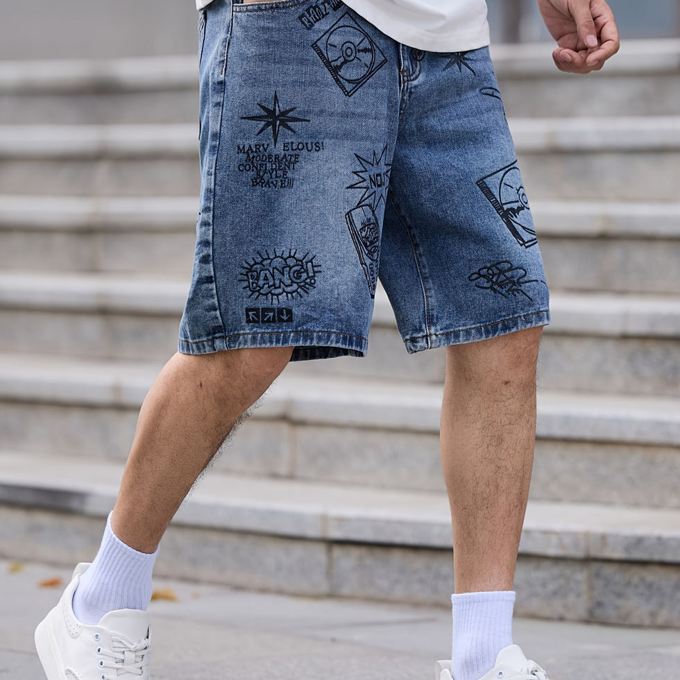 [Streetwear Denim Shorts] Streetwear Cartoon Graphic Print Unisex Loose-Fit Blu