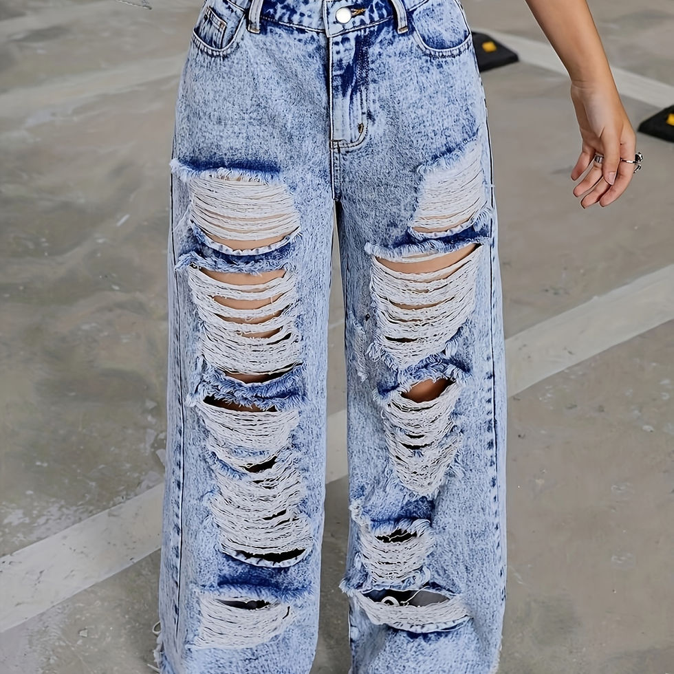 Teen Y2K High-Waisted Distressed Wide-Leg Jeans - Wash Blue Frayed Hem & Belt L