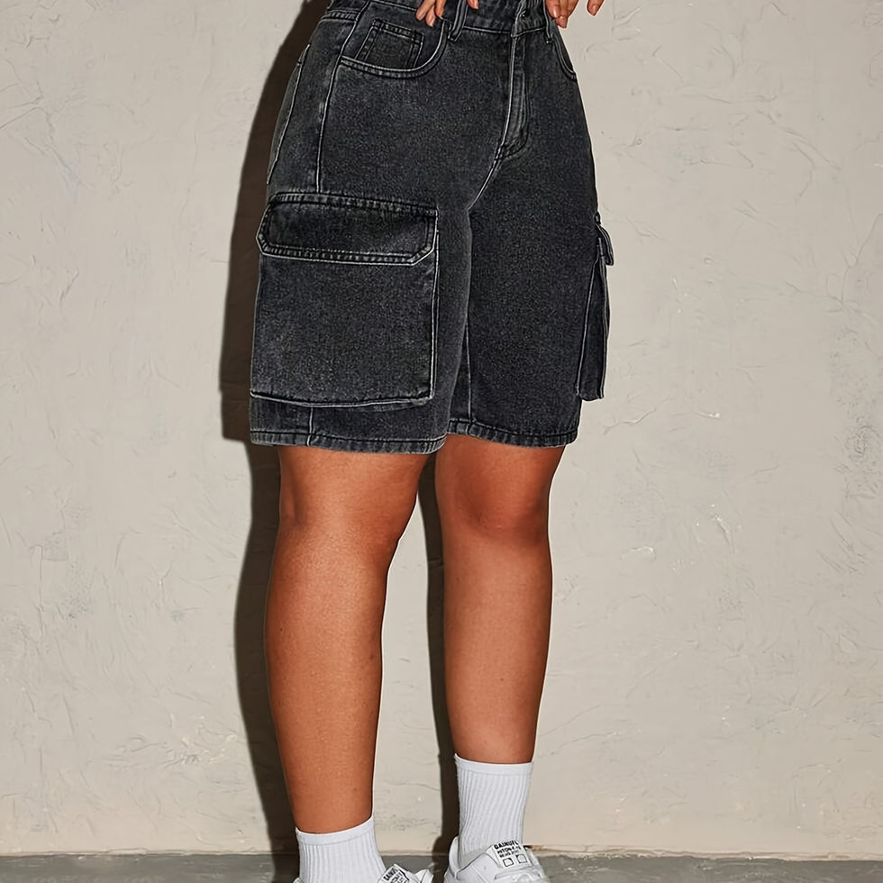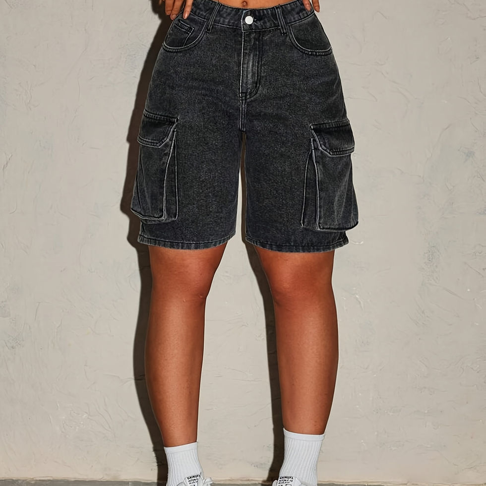 - [Vintage-Inspired Denim Shorts] Vintage-Inspired High-Waisted Women's Denim Shorts with Multiple Pockets | Button Closure, Stretch Fabric, White Socks & Sneakers, Casual Summer Outfit