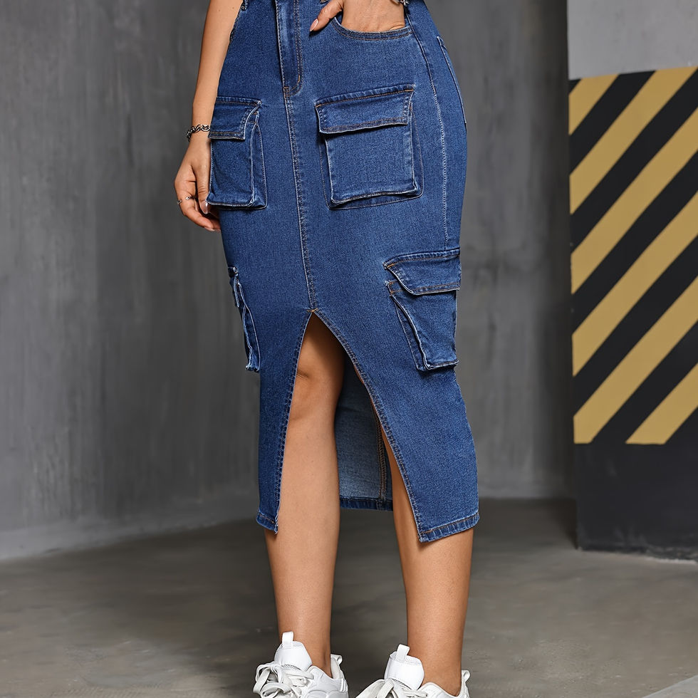 Women's Denim Midi Skirt, Solid Color, Stretchy Fabric, Sexy Style, No Belt, Wa