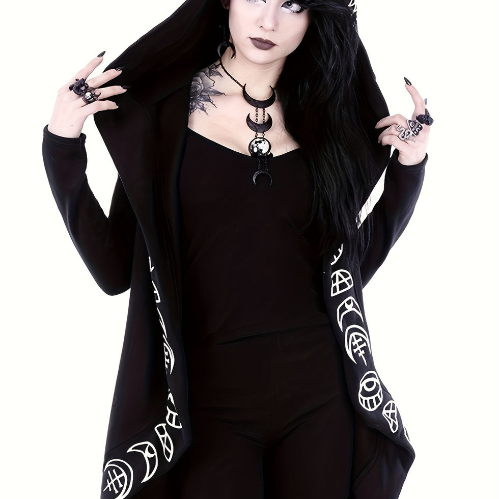 Women's Hooded Cardigan With Witchcraft Pattern, Gothic Style, Long Sleeves Wit