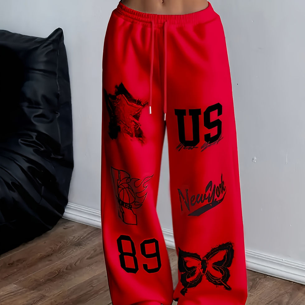 Women'S Red Jogger Pants with "US" Print - Casual Loose-Fit Long Pants, Drawstr