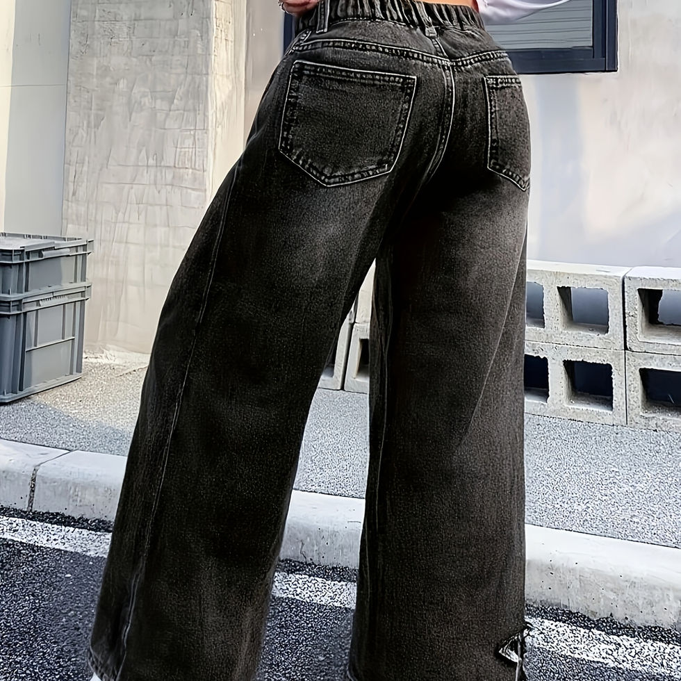 Y2K Style Black Washed Denim Jeans with a Five-Star Patch Design, Trendy And Ve