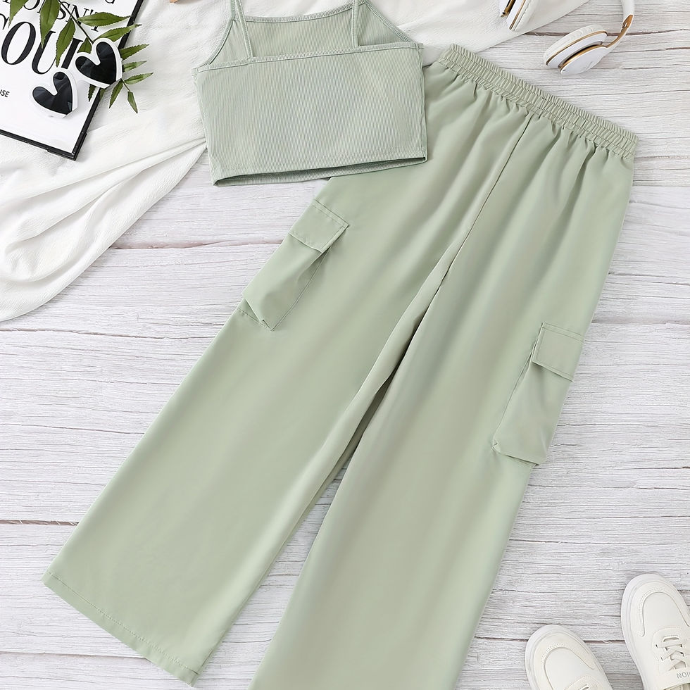 Youth Fashion Casual Design Strapless Top + Elastic Waistband Pocket Cargo Pant